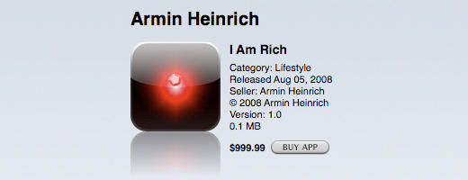 В августе в магазине приложений для Apple "Apple App Store" появилась самая странная позиция за всю историю продаж - приложение для iPhone под названием "I Am Rich" ("Я богат"). Оно не делает абсолютно ничего, кроме как ставит на экран весьма уродскую картинку. Зато стоит - 999 долларов. Типа - статусная штука.